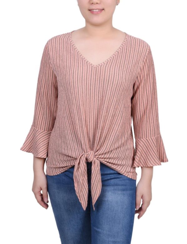 Elevate your everyday style with this effortlessly chic NY Collection top designed to complement your petite frame. The beautifully textured knit fabric and elegant 3/4 bell sleeves create a sophisticated silhouette that moves gracefully with you. Featuring a flattering V-neck and adjustable front tie, this versatile top transitions seamlessly from daytime casual to evening elegance.