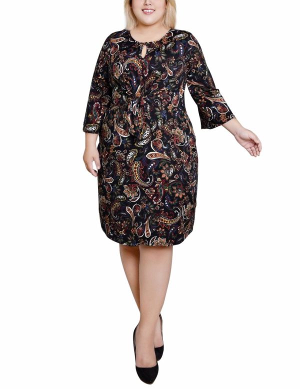 Women Dressbarn Dresses | Cypress Inca Gold Navy Zigzag 3/4 Roll Tab Sleeve Belted Shirtdress