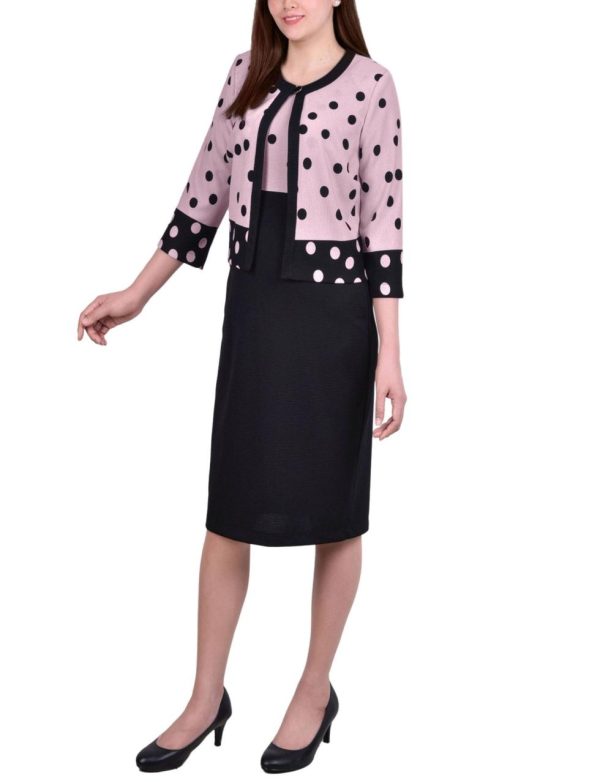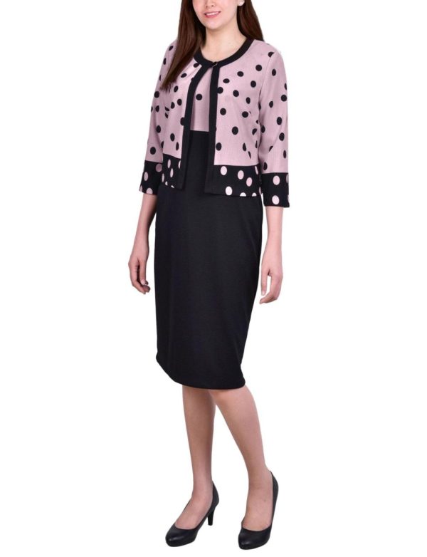 Make a striking statement with this bold dotted pattern and modern colorblock design. The versatile 3/4 sleeve jacket layers perfectly over a sleeveless dress, creating a complete outfit solution that transitions effortlessly from day to evening.