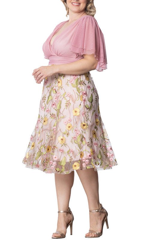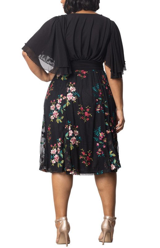The Lillian Embroidered Cocktail Dress delivers sophisticated style for special occasions, featuring a black mesh bodice, surplice neckline, double layer flutter sleeves and a softly shirred waistband. The floral embroidered skirt includes godets for elegant movement and flattering drape.