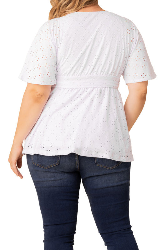 Discover the perfect warm-weather essential with our Plus Size Sunny Day Eyelet Top, designed to keep you cool and confident all season long. This breezy blouse features a flattering surplice neckline and elegant kimono-style sleeves that drape beautifully over your curves. The shirred waistband creates a defined silhouette while the flowy peplum adds a stylish, feminine touch that moves with you.