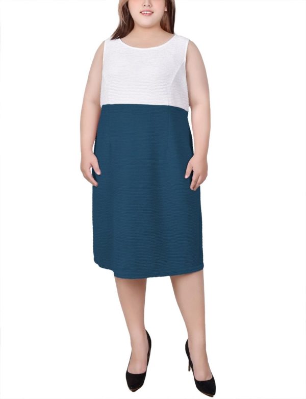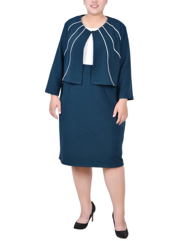 With bold contrast piping details, this color-blocked dress is layered under a 3/4 sleeve jacket, perfect for any work day.