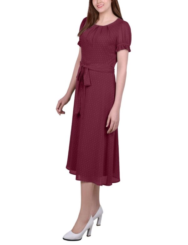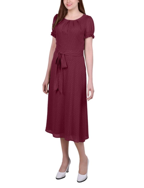 NY Collection presents this sweet and simple swiss dot dress, with a tie waist and rouched sleeves for the perfect special occasion dress.