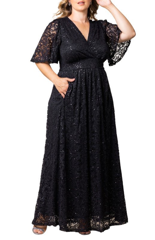 Steal the spotlight at your next soiree in our Plus Size Luminous Sequin Lace Evening Gown. This party dress features a flattering surplice neckline, flirty flutter sleeves, and a graceful A-line silhouette that elegantly drapes to the floor. With a hidden surprise pockets this formal gown is perfect for the best-dressed curvy wedding guest or any special occasion, from cocktail parties to semi-formal gatherings, black-tie events, and galas. Available in classic colors like black and navy blue, this long formal dress is designed for curvy figures and crafted exclusively for plus size women. Exclusively in sizes 0x,1x,2x,3x,4x,5x, 12,14,16,18,20,22,24,26,28,30 and 32.