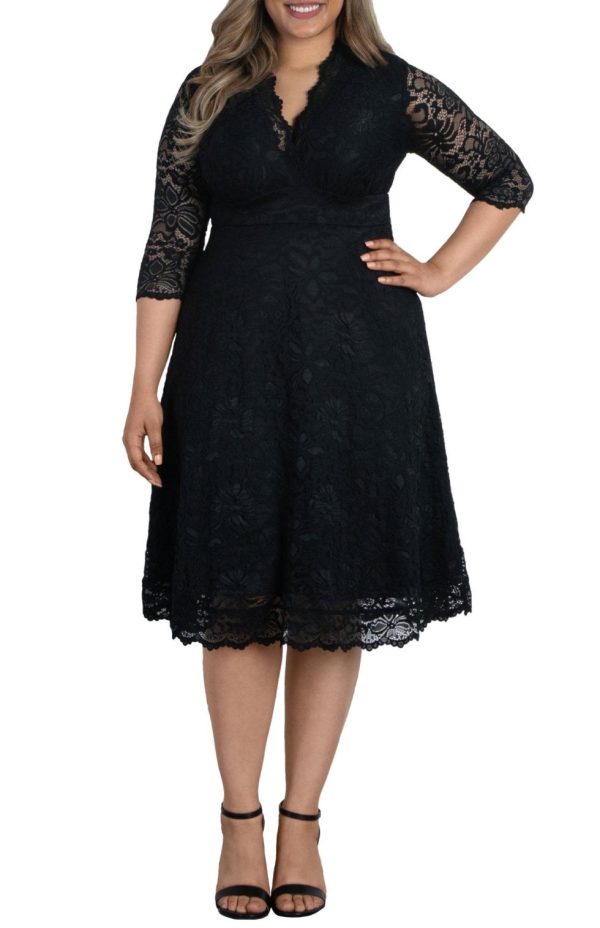The Mademoiselle Lace Cocktail Dress is a special occasion A-line midi length dress with scalloped lace and fit and flare silhouette. Party perfect for day, evening, formal, semi-formal, wedding guest, bridesmaid, and mother of the bride / groom. Available in women’s regular and plus sizes.