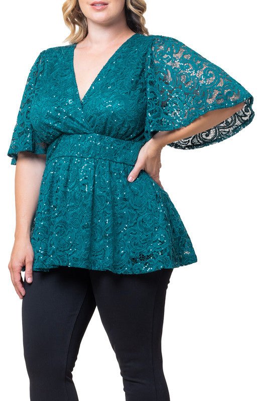 Designed to captivate, our Stardust Sequin Lace Top seamlessly combines style and comfort. Featuring a surplice neckline, cinched waist and flutter sleeves, this plus-size dressy lace blouse is an essential addition for any special occasion.