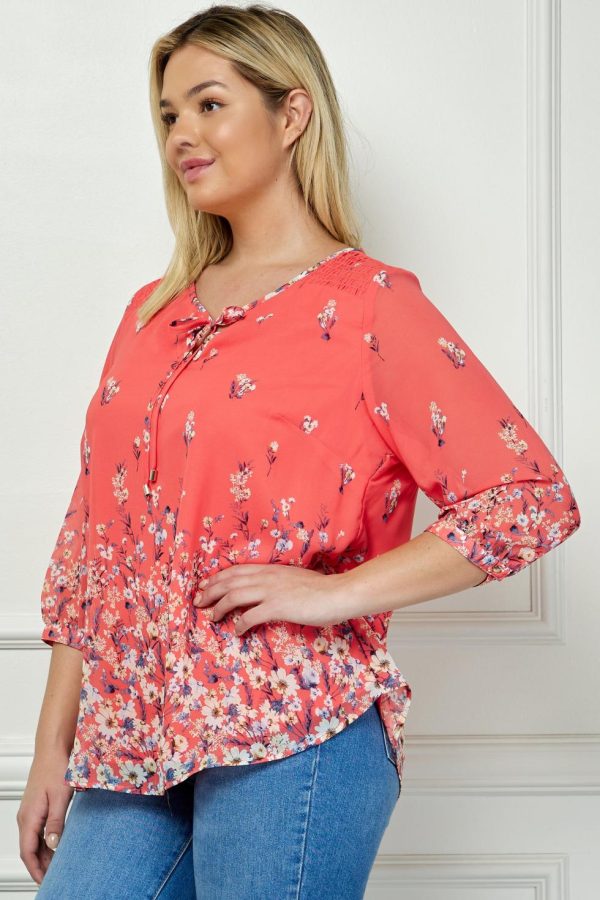 3/4 Button Cuff Sleeve Beaded Tie Front Neck Border Print Blouse in Border Print Chiffon with Spring Bloom Print and colors, a perfect blouse to wear for Spring & Summer.