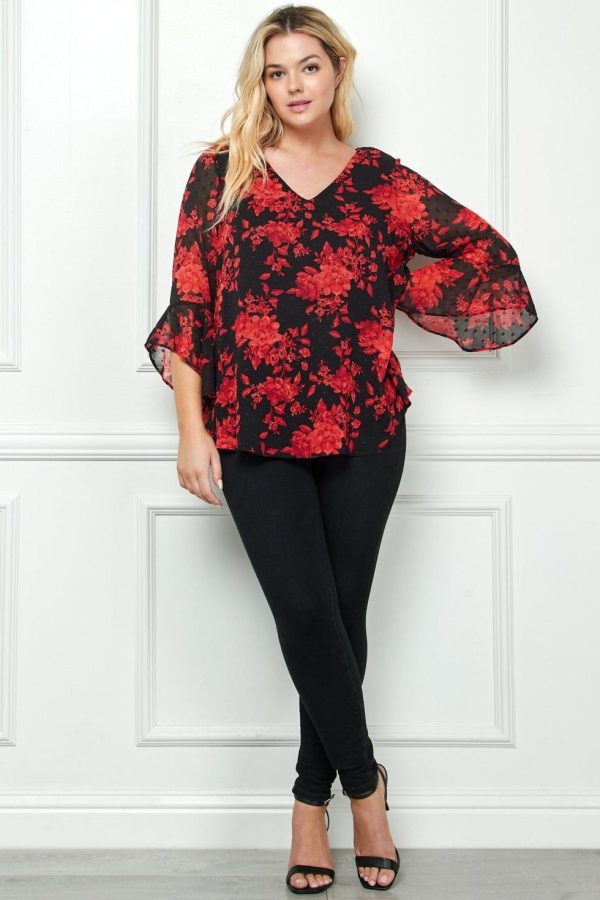 3/4 Ruffle Sleeve V-Neck Swing Blouse in Print Poly Clip Dot, head turner textured blouse for the Holiday, and great to wear to show your dance moves.