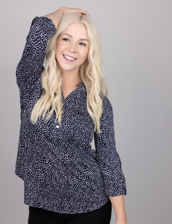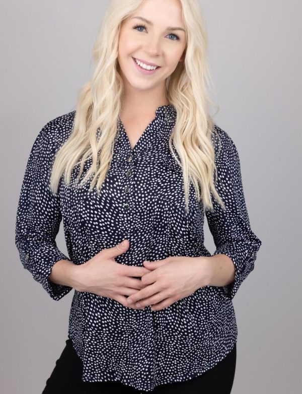 Stay stylish in a top that features small polka dots and a Mandarin collar for simple accessories. The Spandex and polyester-made piece also has roll-tab sleeves and a shirt-tail hemline that you can tuck underneath a pair of trousers. The silver button placket adds style as well. Give your office look an upgrade by choosing this Cocomo popover.