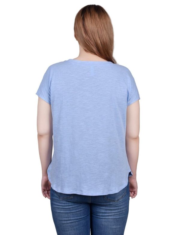 Give your tee some flair with this textured slub knit tee with flower detail. Great with shorts or your favorite jeans.