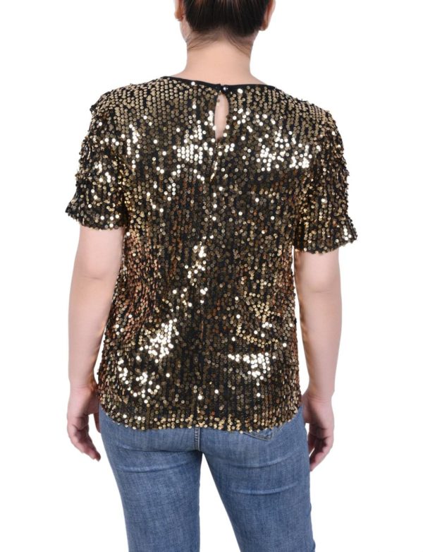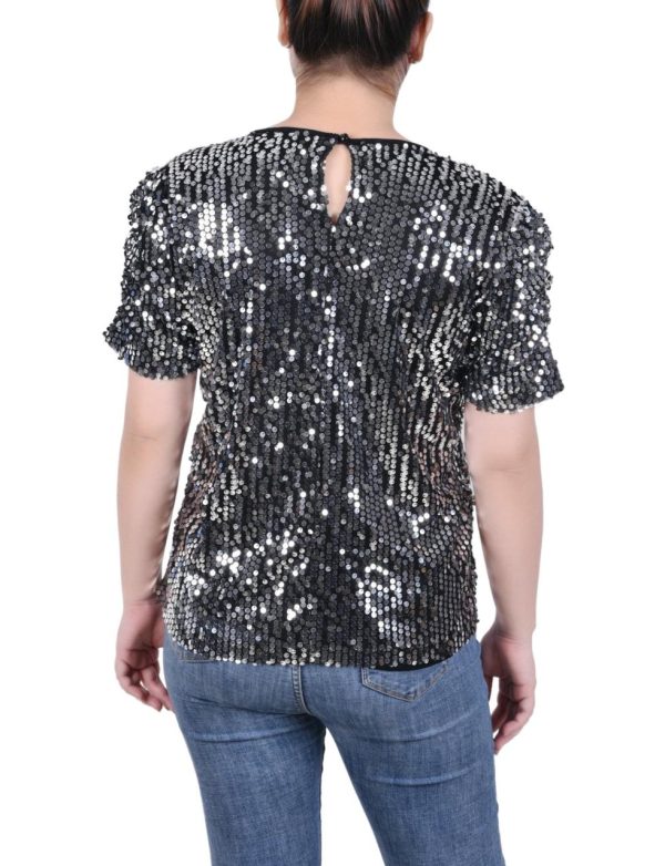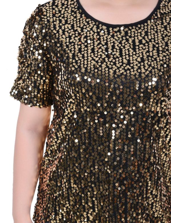 Make a stunning impression at every holiday gathering with this exquisite NY Collection sequined top featuring elegant rouched sleeves. Perfectly pair with velvet bottoms for a sophisticated seasonal ensemble that turns heads.