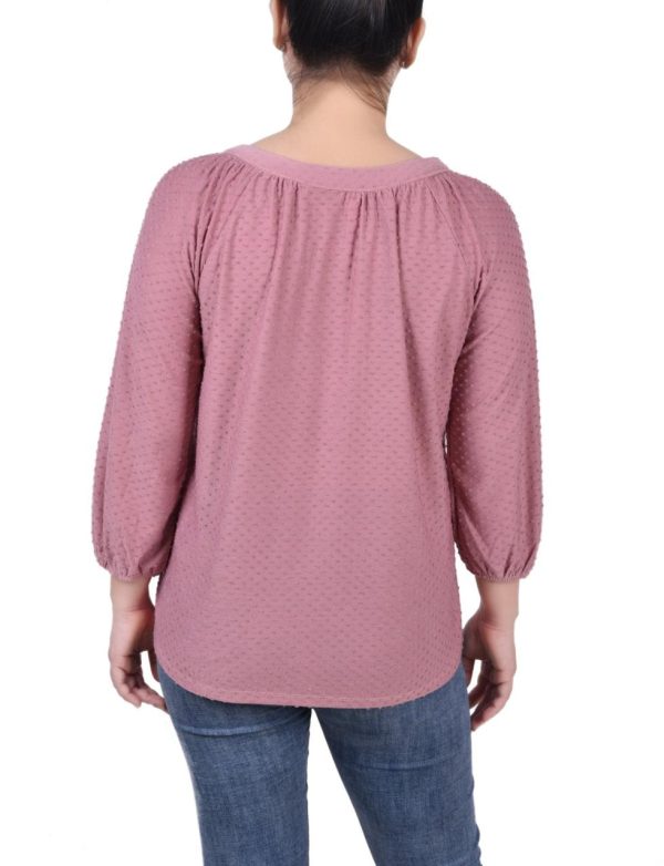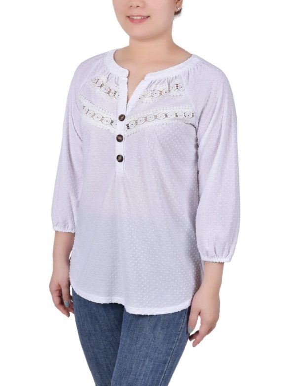 This beautifully crafted Swiss dot knit top combines timeless elegance with modern comfort. The delicate crochet inset creates an eye-catching neckline detail that elevates your everyday style. Designed with flattering raglan sleeves and elastic cuffs that provide a perfect fit for all petite frames.
