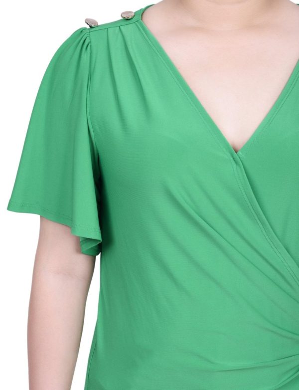 Experience effortless elegance with this beautifully designed wrap top from our NY Collection, featuring a flattering silhouette that enhances your natural shape with delicate flutter sleeves and sophisticated shoulder button detailing.